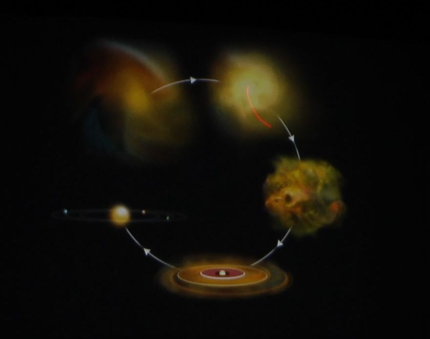 Hier sieht man die Entwicklung eines Sonnensystems aus der lange währenden Verdichtung einer sich bewegenden
