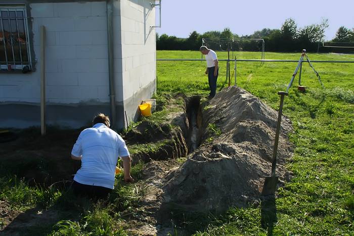 21.08.2010 : Die Verlegung des fließstoffumwickelten Drainagerohrs