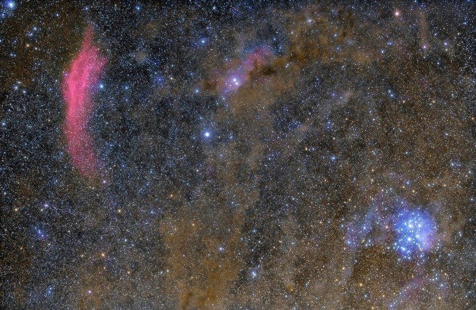 Einbettung der Plejaden, z.T. mit rötlichem (H-alpha-) Wasserstoff-Anteil, welche die Bewegungsrichtung dieses bekannten
