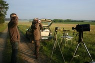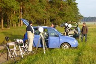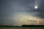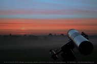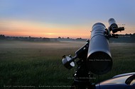 in der beginnenden Morgendämmerung zunächst etwas Bodennebel, Tau auf den Fernrohrtuben, Schleierwolkenbänder