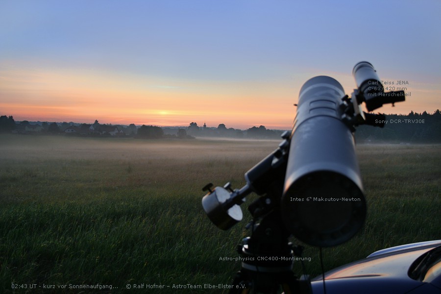 "halben Telementor": Carl Zeiss JENA C-63mm, f=420mm. Beide Fernrohre (jeweils im Eigenbau-Tubus) sowie