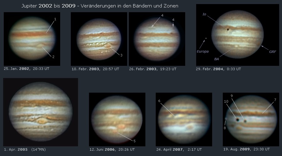 Bänder können zeitweilig verschwinden, erstaunlich stabil ist der GRF (Große Rote Fleck), der sich jedoch deutlich in der