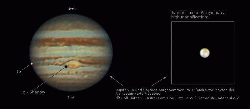 Bei sehr gutem Seeing lassen sich in Instrumenten ab etwa 12" Öffnung Details auf den Jupitermonden erkennen.