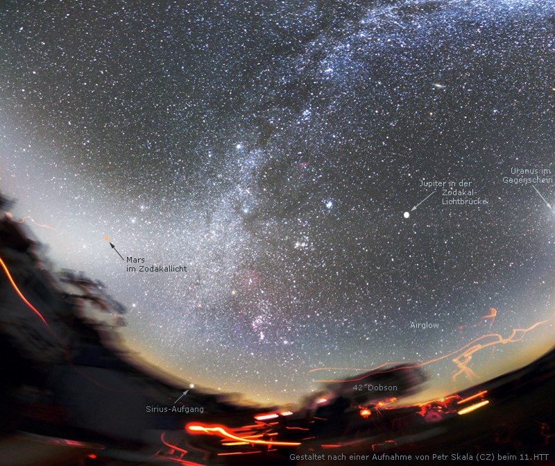 Wie immer wird das Zodiakallicht über dem Osrt-Horizont sichtbar sein. Die Lichtbrücke erstreckt sich