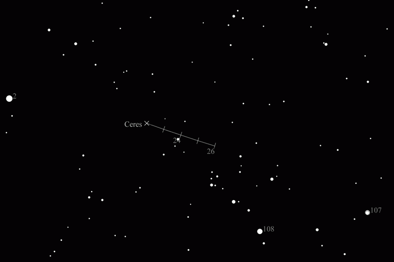 Der knapp 1.000 km durchmessende Zwergplanet (1) Ceres kulminiert rund 1 Stunde nach Mitternacht und erreicht