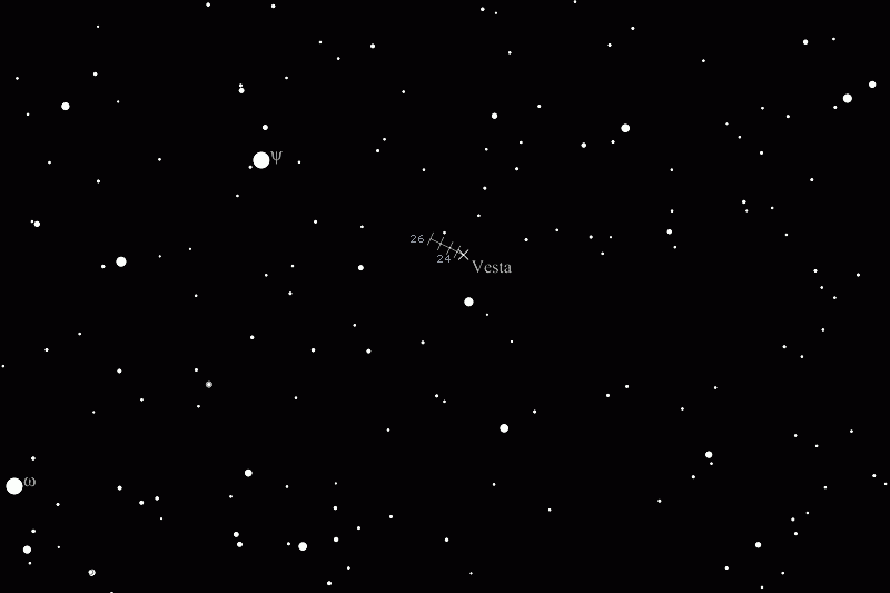Scheinbare Bahn des Asteroiden (4) Vesta vom 22. bis 26. September 2011, jeweils 0:00 UT (internation.