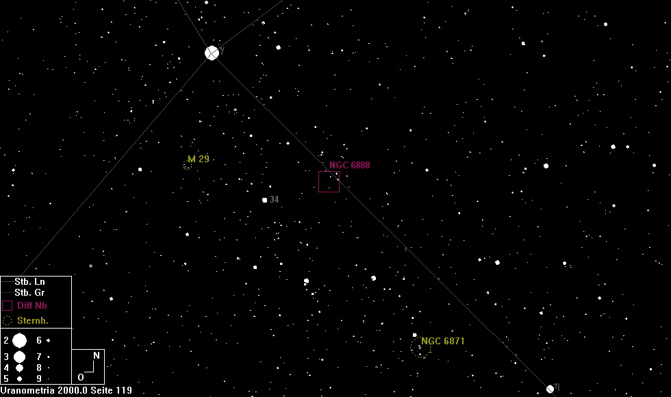 Sicherer ist es allerdings, daß man zuerst freisichtig von γ Cyg aus den ca. 5mag Stern 34 Cyg sucht und